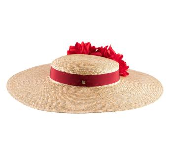 Deze Provençaalse hoed van genaaid stro. De bloemige samenstelling onthult vurig, stralende kleuren. De breedte zal goed het hoofd bedekken en zelfs schaduw bieden voor de schouders.