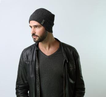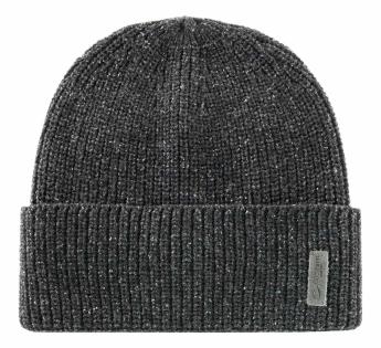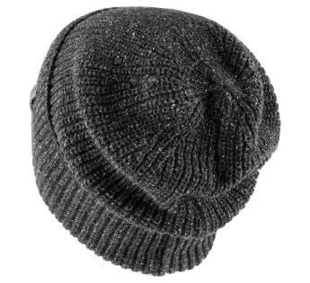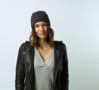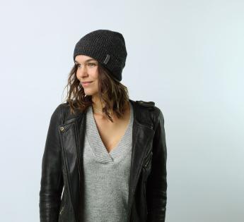 Muts gebreid van dubbel jersey wol. Versleten antracietgrijs, zijn enigszins versleten uiterlijk voegt meer karakter en tijdloosheid toe. De onmisbare muts is hier afgewerkt met een omslag voor een goede pasvorm. Een leren badge versterkt de vintage en traditionele uitstraling.