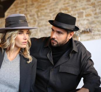 Porkpie-model versierd met een garniture van zwart en grijs gestreept gros grain. Een dubbele veter van zwart kunstleer met een zwarte metalen bevestiging completeert deze galon, oorspronkelijk ontworpen om een contrastspel tussen de materialen te creëren. De hoed is zowel sportief als chic en zal onze silhouette met grote effectiviteit accentueren.