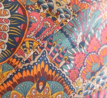 Afgedrukt: Psychedelisch motief. Een explosie van kleuren en details geïnspireerd op de iconische "Liberty"-ontwerpen
