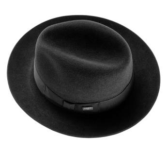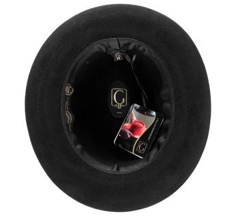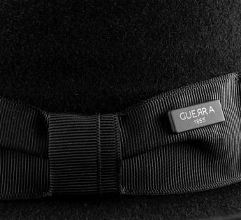 Met de hand vervaardigd in Italië, belichaamt deze vilten hoed het toppunt van verfijnde elegantie. Het geborsteld vilt onthult een fluweelachtige afwerking die het licht vangt en zijn delicate kenmerken benadrukt. Versierd met een brede grosgrain lint in een klassieke knoop, is de hoed voorzien van een Guerra 1855 signatuurplaatje, een bewijs van ongeëvenaard vakmanschap.