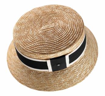Hoed versierd met een laag van contrasterende gros grain om grafische lijnen te creëren. De zeer hoge gros grain is maar liefst 6 cm, wat een retro-sportieve uitstraling geeft die zowel chic als elegant is.