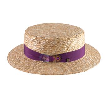 Canotier hoed versierd met een strik, gemaakt met metalen stempels. Deze creëren iriserende reflecties en maken het model origineler.