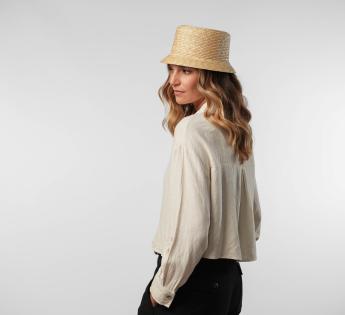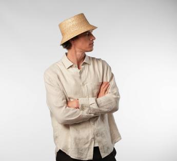 Vissershoed gemaakt van genaaid stro. De hoed is "nude" gelaten, dat wil zeggen zonder trimmingen. Tot slot brengt een vleugje vernis een lichte reflecterende glans aan het geheel.