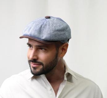 Gemaakt van onmisbare materialen voor de zomer, speelt deze pet met het contrast tussen de blauwe stof en het mooie imitatie leer van de vizier en de versierde knop. Het ontwerp onthult een Hatteras cap door zijn ruime vormen en Ierse stijl door zijn acht panels.