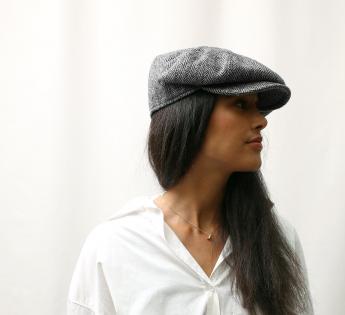 Gemaakt van virgin wool, geauthenticeerd door het waardevolle label Harris Tweed, handgesponnen en geweven in Schotland, heeft deze hoofddeksel brede contouren. Zeker charme met zijn ruime vorm, die bovendien de mogelijkheid biedt om aan de zijkant te worden gedragen. De zachte en duurzame wol onthult klassieke, tijdloze, traditionele visgraatmotieven.