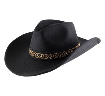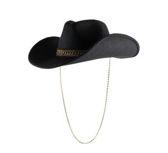 Gemaakt van wol vilt, is hij zowel warm, waterbestendig als duurzaam. De hoedenband versierd met gouden kettinkjes voegt een lichte en contrasterende toets toe, tussen classicisme en durf. De fijne kinband in kettingstijl benadrukt zijn karakter en zorgt voor een zekerdere draagwijze.