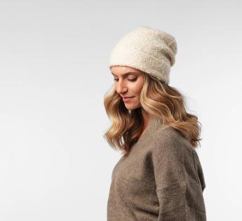 Warmte en omhullende zachtheid voor deze muts met bouclétextuur en een moderne uitstraling. Het pluizige materiaal met een zachte aanraking biedt uitstekende isolatie terwijl het ademend blijft, ideaal voor koude dagen. De soepele snit met geïntegreerde omslag past zich comfortabel aan alle vormen aan zonder te knellen.
