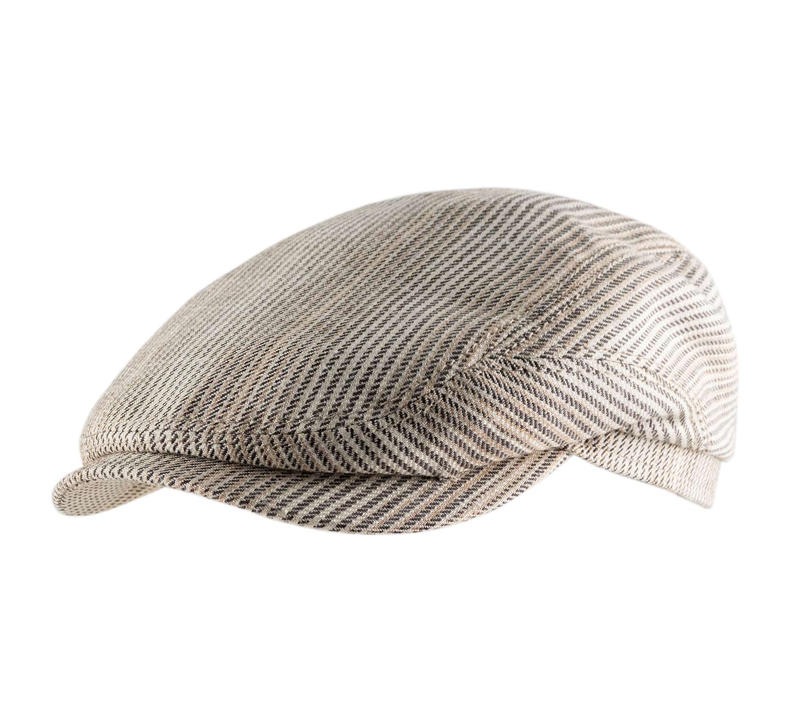 Platte pet van Stetson. De stof, geweven in Ierland, combineert katoen, linnen en zijde om een nobel materiaal te bieden met een delicate aanraking en luchtige lichtheid. De fijne diagonale strepen voegen een subtiele visuele dynamiek toe.