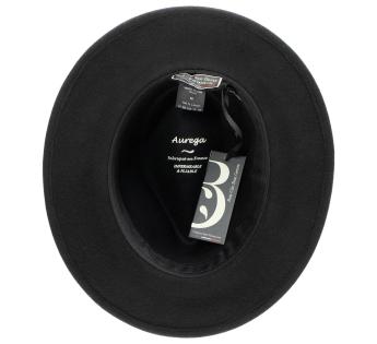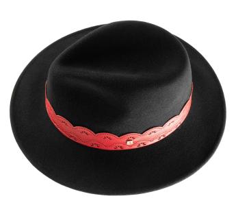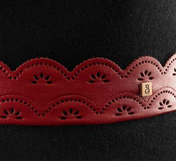 De hoedenband van imitatieleer, bewerkt als opengewerkt kant, voegt een vleugje zelfverzekerde vrouwelijkheid toe. Het intense contrast geeft een bohemien en rock chique energie. Het discrete Label markeert onze ambachtelijke creatie. Deze hoed belichaamt de perfecte balans tussen verfijning, originaliteit en vrijheid van stijl.
