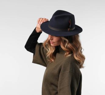 De gestikte hoedenband van leer voegt een vleugje authenticiteit toe, terwijl de afneembare kleurrijke veer een expressiever accent biedt. Een model met een vrije geest, dat elegantie zonder rigiditeit omarmt.