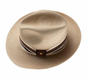 Ambachtelijke elegantie en sportieve uitstraling komen samen in deze uitzonderlijke Panama hoed, vervaardigd in onze Lyonse werkplaats. De hoedenband in textuurgebreide stof, geïnspireerd op het polo, is verfraaid met een bicolore satijnen ring voor een verfijnde touch. Een lichte en ademende hoed, perfect voor een chique en casual look.