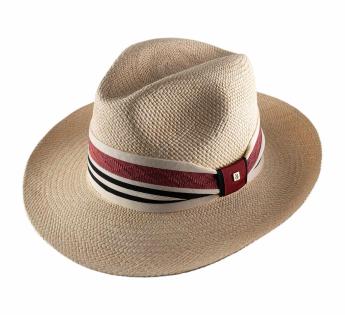 Ambachtelijke elegantie en sportieve uitstraling komen samen in deze uitzonderlijke Panama hoed, vervaardigd in onze Lyonse werkplaats. De hoedenband in textuurgebreide stof, geïnspireerd op het polo, is verfraaid met een bicolore satijnen ring voor een verfijnde touch. Een lichte en ademende hoed, perfect voor een chique en casual look.