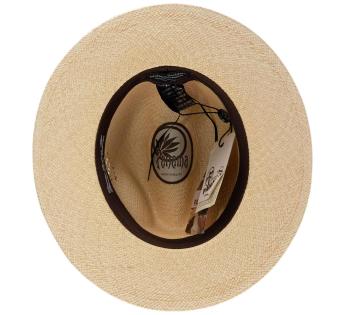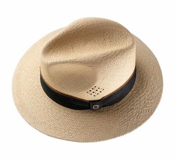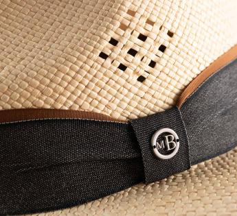 Deze hoed verleidt met zijn sobere, verzorgde lijn en onthult vervolgens zijn eigenheid in een opengewerkt motief, als kant fijn getekend in de vezels van de Panama hoed. Een kostbaar detail, bijna als een juweel, dat het licht vangt en de uitstraling onderstreept.
