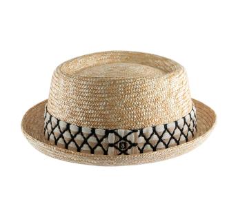 Als je op zoek bent naar een verfijnde hoed met een vleugje originaliteit, is deze porkpie van stro een uitzonderlijke keuze. De verfijnde galon, gemaakt van een assemblage van delicaat gestikte veters, vormt een elegant patroon van zwarte ruiten. Een minutieus werk dat diepte toevoegt en de iconische silhouette van dit tijdloze model subtiel benadrukt.