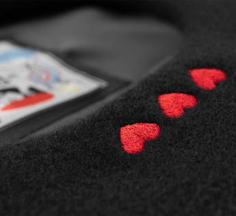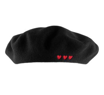 Deze zwarte baret van zuivere merinowol is versierd met drie geborduurde rode harten, als een subtiele verwijzing naar een verhaal dat nog geschreven wordt. Een discreet maar expressief detail, universeel symbool van liefde en van alles wat nog moet komen.