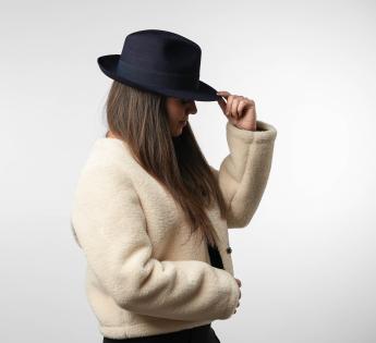 Een fijne, soepele vilten hoed gevormd op een fedora met een lange, gesneden rand. De elegante fedora is hier vereenvoudigd met een discrete, effen kleur. De kroon is omringd door een band met een origineel en dynamisch strikje dat, altijd in eenvoud, een subtiel ton-sur-ton contrast biedt. Het zal zeker meer stijl toevoegen.