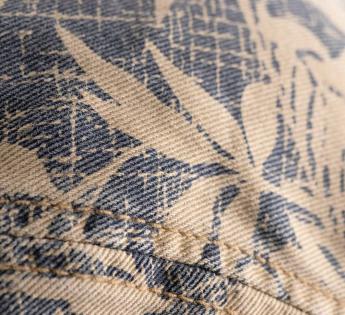 Met het blauwe botanische motief op een beige achtergrond straalt deze duckbill cap een exotische stijl uit, verlevendigd door een frisse en beheerste grafische toets.