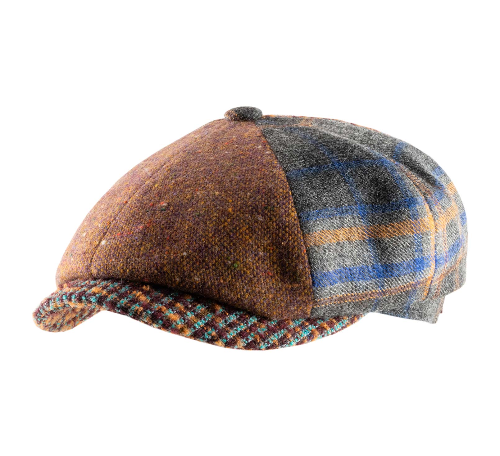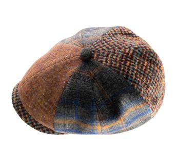 Pet met een ruime kroon van 8 panels, verlengd met een brede vizier. Een creatie in patchwork-stijl met ruiten op verschillende banden van ongebleekte wol. Het biedt een originele samenstelling van verschillende sobere, complementaire en licht retro kleuren, voor een uitstraling die bij elk van onze stijlen past.