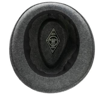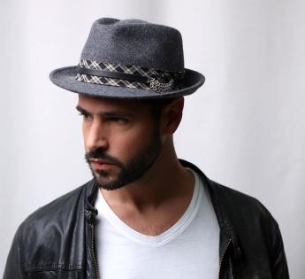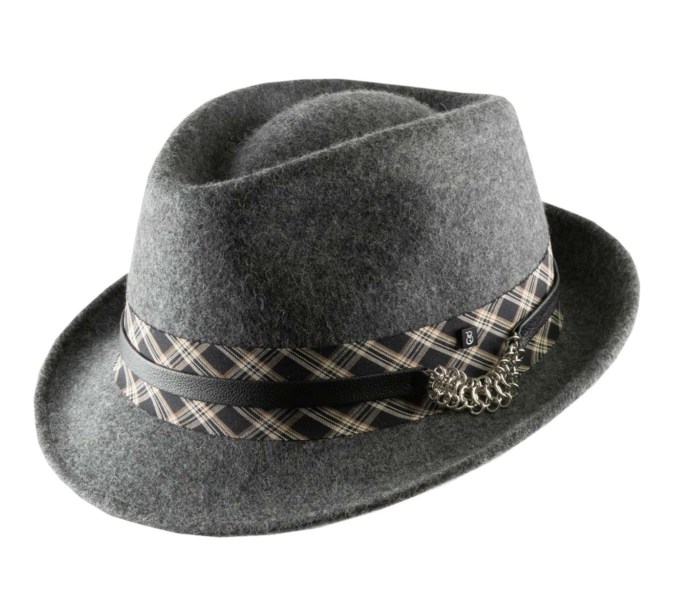 Trendy materiaalcombinatie voor deze Trilby hoed. Fris in stijl en warm in bedekking, zijn vilt is versierd met een dubbele hoedenband met een brede strook Schotse ruit, bovenop een fijne leren riem die een reeks gemetalliseerde ringen verbindt die een vleugje glans toevoegen. In zijn veelzijdigheid volgt de trilby de trends met nonchalance. Hij doorbreekt de tijd dankzij een sterk verheffend vermogen op alle outfits en bij elk evenement.