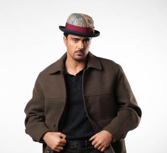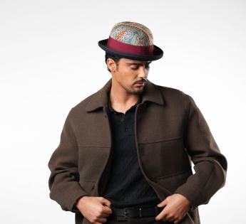 Een opvallend stuk in beperkte oplage, deze Bolhoed bedekt met vintage paisley stof onderscheidt zich door zijn unieke uitstraling. Elk exemplaar heeft een andere patroonplaatsing, waardoor elke hoed echt uniek is. Een zorgvuldig bewerkte trimmen, versterkt met een tweekleurig hoedenband en een hanenveer met groene en bordeauxrode tinten, tekent een gedurfde en verfijnde silhouet.