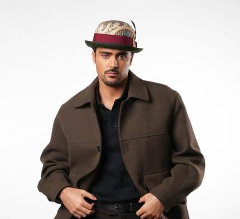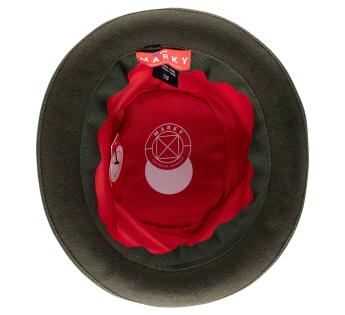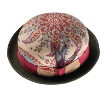 Een opvallend stuk in beperkte oplage, deze Bolhoed bedekt met vintage paisley stof onderscheidt zich door zijn unieke uitstraling. Elk exemplaar heeft een andere patroonplaatsing, waardoor elke hoed echt uniek is. Een zorgvuldig bewerkte trimmen, versterkt met een tweekleurig hoedenband en een hanenveer met groene en bordeauxrode tinten, tekent een gedurfde en verfijnde silhouet.