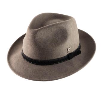 Eenvoudige verfijning voor deze vilt hoed met tijdloze elegantie. Volledig in sobere stijl, is hij chic ondanks zijn discretie en biedt hij pure elegantie door een zo verfijnd evenwicht. Gemaakt in Italië, is de rand verstelbaar en stelt het je in staat om optioneel te genieten van de Fedora-stijl of de Player-look, altijd met een onweerstaanbaar effect.