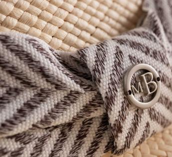 Het brede grosgrain lint met visgraatmotief, versierd met een grafisch ton-sur-ton patroon, valt op door een halve strik aan de achterkant, lichtjes omhoog gezet, wat een subtiele noot van verfijning toevoegt.