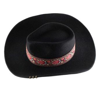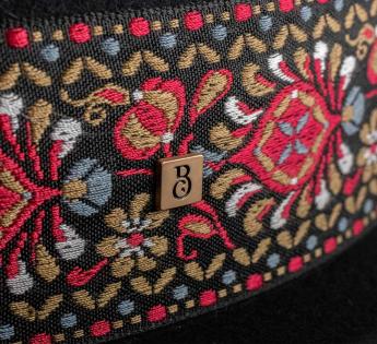 Het geborduurde band, met rijke bloemmotieven, voegt een vleugje exotisme en verfijning toe. Drie metalen sieraden bevestigd aan de rand voegen een originele en assertieve noot toe. Een kwaliteitshoed met een nomadische geest, perfect voor degenen die op zoek zijn naar een accessoire met een sterke persoonlijkheid.