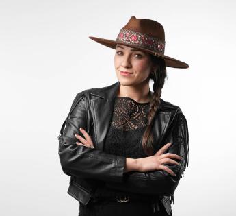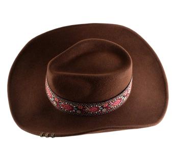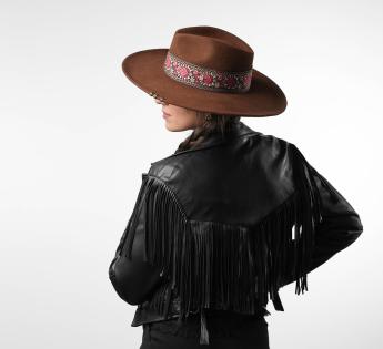 Western hoed met een bohemien stijl, vervaardigd in ons atelier in Lyon. Gemaakt van Italiaans wol vilt, warm en van nature waterbestendig, valt hij op door zijn brede, latte-kleurige rand die kan worden aangepast aan de gewenste look. Een ambachtelijke creatie ontworpen om de winter met elegantie en karakter te trotseren.