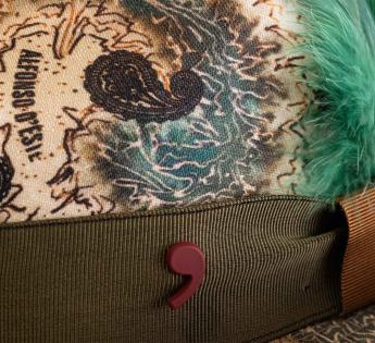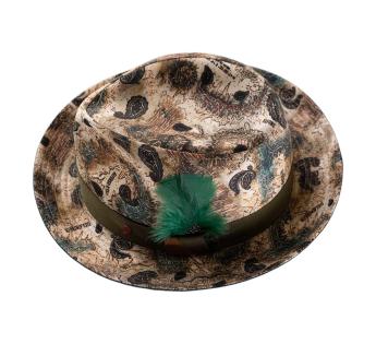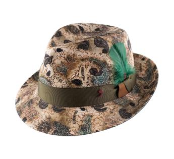 Deze Player hoed van Alfonso D’Este is veel meer dan een accessoire, het is een verzamelobject. De cartografische print en paisleymotieven op verfijnd linnen vertellen een verhaal van reizende elegantie. Met een levendige smaragdgroene veer en verfijnde afwerkingen straalt hij een onmiskenbare artistieke aanwezigheid uit.