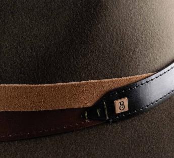 Een alliantie van stijl en karakter, deze vilten hoed onderscheidt zich door zijn leren trimmen met meerdere texturen. Stiksels, ton-sur-ton borduurwerk en een gouden ontwerpershandtekening verfraaien deze ruwe maar elegante mix. Waterbestendig en opvouwbaar, hij begeleidt je moeiteloos, of je nu in de stad bent of op reis.