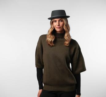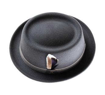 PorkPie hoed van Australische schapenwol, zowel elegant als functioneel. De platte kroon en de rand opstaand creëren een scherpe, stedelijke silhouet, ideaal om een outfit subtiel te structureren. Ontworpen in natuurlijk waterafstotende en soepele wol, weerstaat het de uitdagingen van het dagelijks leven terwijl het comfort en ondersteuning garandeert.