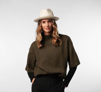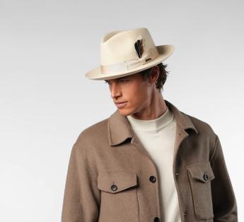 De middellange rand, volledig omhoog gekruld, geeft deze Fedora hoed een zachte en zeer moderne lijn. Het strakke ontwerp krijgt karakter dankzij een natuurlijke veer die subtiel in de hoedenband van grosgrain is gestoken.