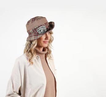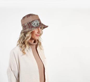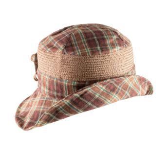 Vrouwelijke zomerhoed versierd met een afneembare broche met een stoffen bloem. Het is een mix van genaaid stro en stof met een ruitmotief in brons. De kroon is omringd door een rand die naar wens kan worden aangepast. Het ontwerp maakt verschillende stijlen mogelijk om telkens een mooie, casual touch aan onze uitstraling toe te voegen.