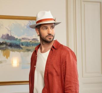 Chique fedora in echte Panama hoed. Het is ontworpen met een mix van materialen. De decoratieve hoedenband van gros grain toont een veer voor een wilde uitstraling en een natuurlijke koord; een creatie die je zowel naar het strand als op avontuur kunt meenemen. Het ontwerp biedt ook een contrast tussen de marine ring en de hoedenband terracotta. De echte Panama is een must voor elke garderobe. Zijn lichtheid, die niet meer bewezen hoeft te worden, stelt je in staat de hitte te weerstaan, maar vooral je look te verfraaien.
