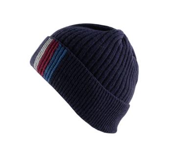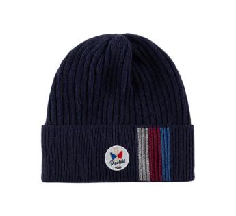 Zacht comfort en gedurfde stijl voor deze geribbelde muts, gemaakt in Frankrijk. Gebreid van gerecyclede garens die wol, kasjmier en viscose mengen, biedt het een zachte sensatie en aangename warmte vanaf de eerste kou. De kleurrijke strepen voegen een grafisch tintje toe dat zijn sobere en eigentijdse uitstraling verlevendigt.