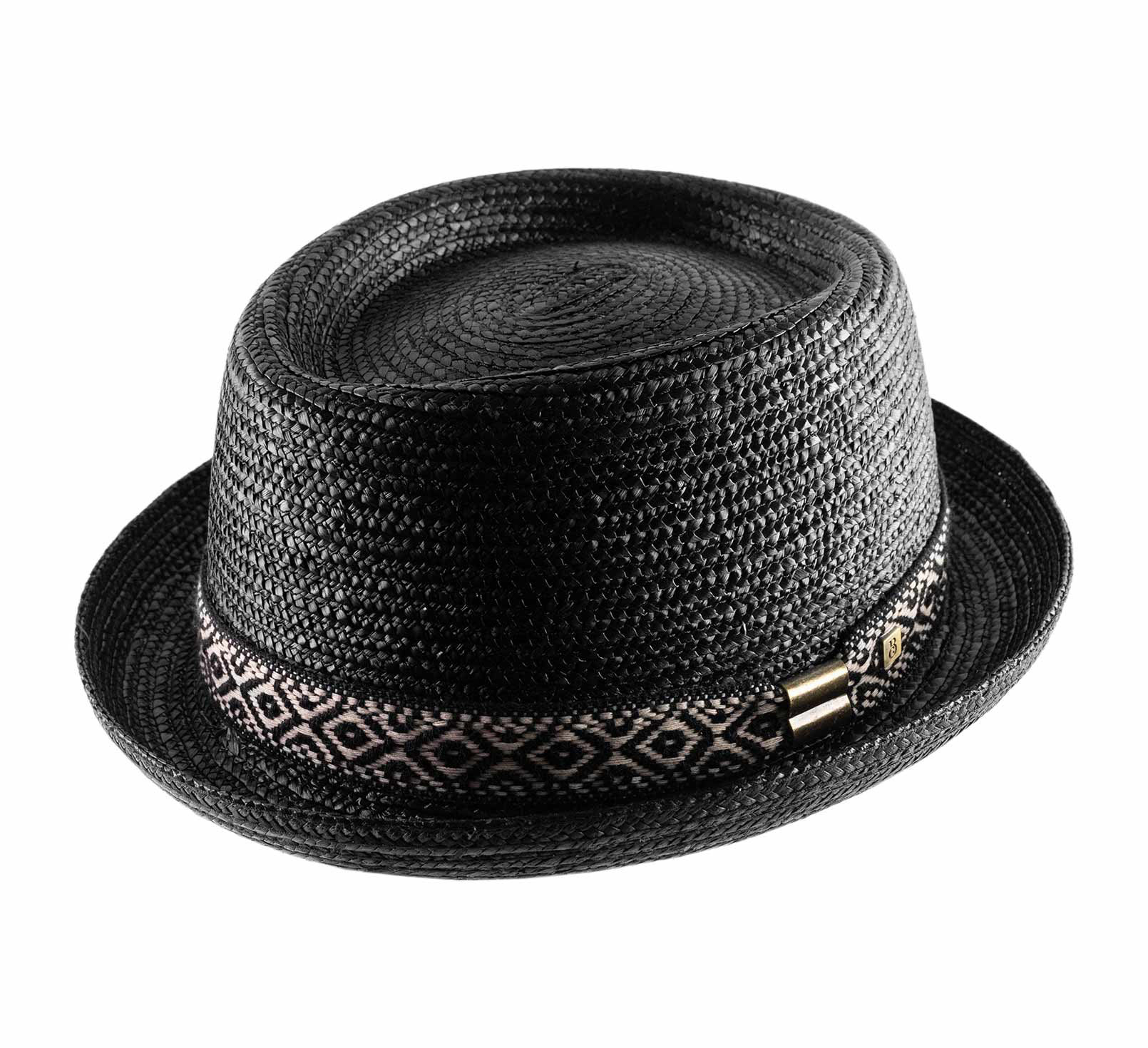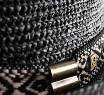 Hoed gemaakt van zeer fijne stro met een korte rand die volledig opstaand is en een ovale kroon. Het model heeft een eigentijdse en chique uitstraling met de metalen passer. Het is omringd door een etnische hoedenband van katoen voor meer originaliteit en onderscheid.