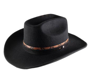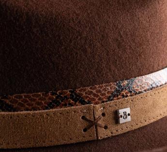 De slangenhuid-effect trimmen, geaccentueerd met een metalen Label, markeert een gedurfde stijl, balancerend tussen rustiek en verfijnd. Dit model is geïnspireerd door de legendes van het Westen, terwijl het een uitgesproken Franse elegantie behoudt. Een hoed met karakter, klaar om zijn weg te banen tussen ambachtelijke traditie en avontuurlijke geest.